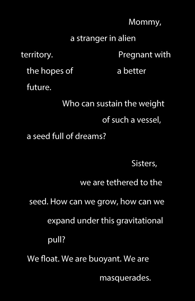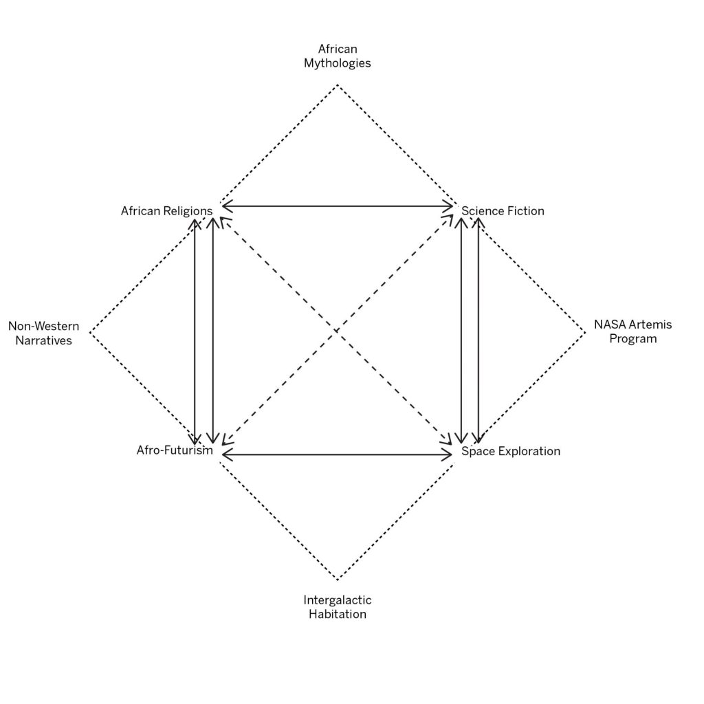 The thesis exists at the intersection of Afro-futurism, African religions, the origins of space exploration, and current international space programs. The particular narrative employed to tell the story of the moon is called an oriki. Oriki is a word originating in the Yoruba tradition and is defined as the verbal, visual, or performed evocation of the essence or origin of its subject.
