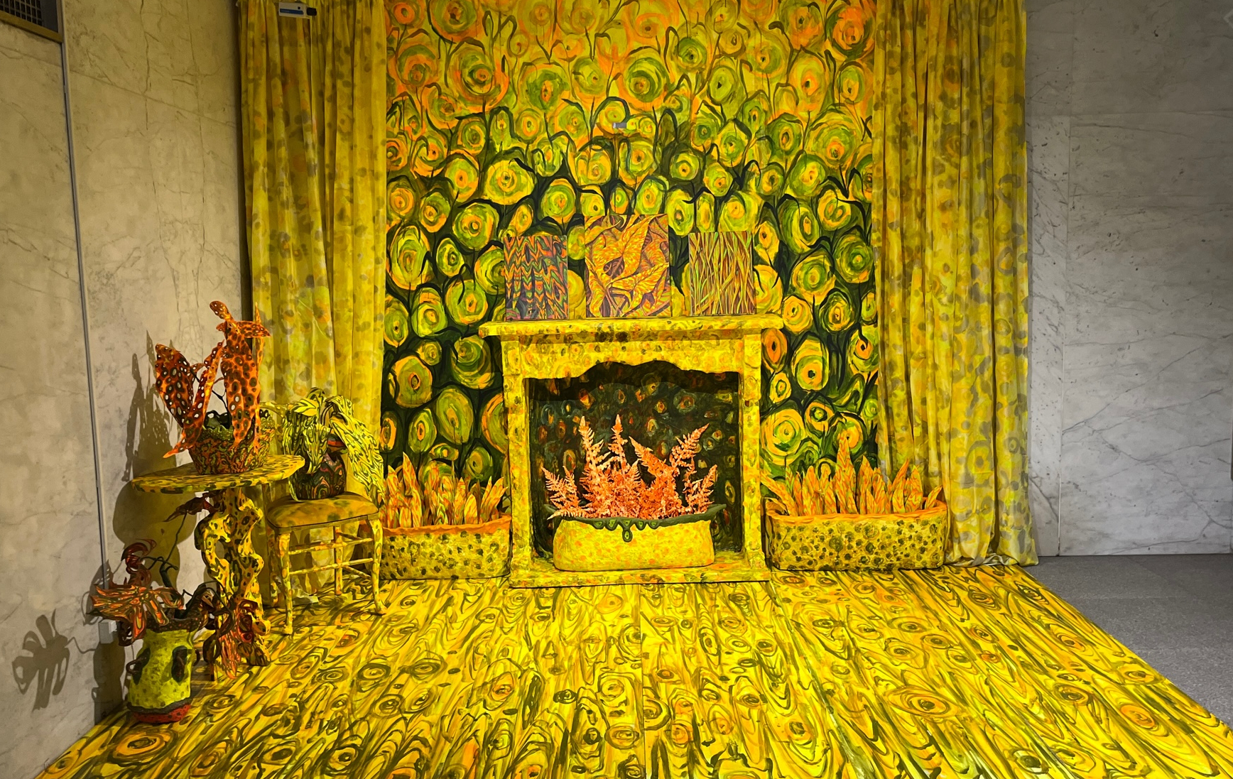 For Phaan Howng’s latest installation, Rise of the Machines Plants, she continues her exploration of the relationship between horticulture and the ecological conditions brought on by globalization and capitalism. On one side of the lobby at 125 Maiden Lane, brightly hand-painted wallpaper, paintings, and sculptures create a Victorian-style parlor that is overtaken by flora that has evolved to camouflage into its surroundings. Originally displayed at Dinner Gallery, the installation refers to the origins of the rare and exotic plant market that arose due to imperialism during the Victorian Era. Opposite the Victorian-style parlor, a hyper-abstracted neon rug serves as a toxic, unnatural landscape from which plants and flora grow as if they are adapting and evolving from an earth corrupted by chemicals and waste.